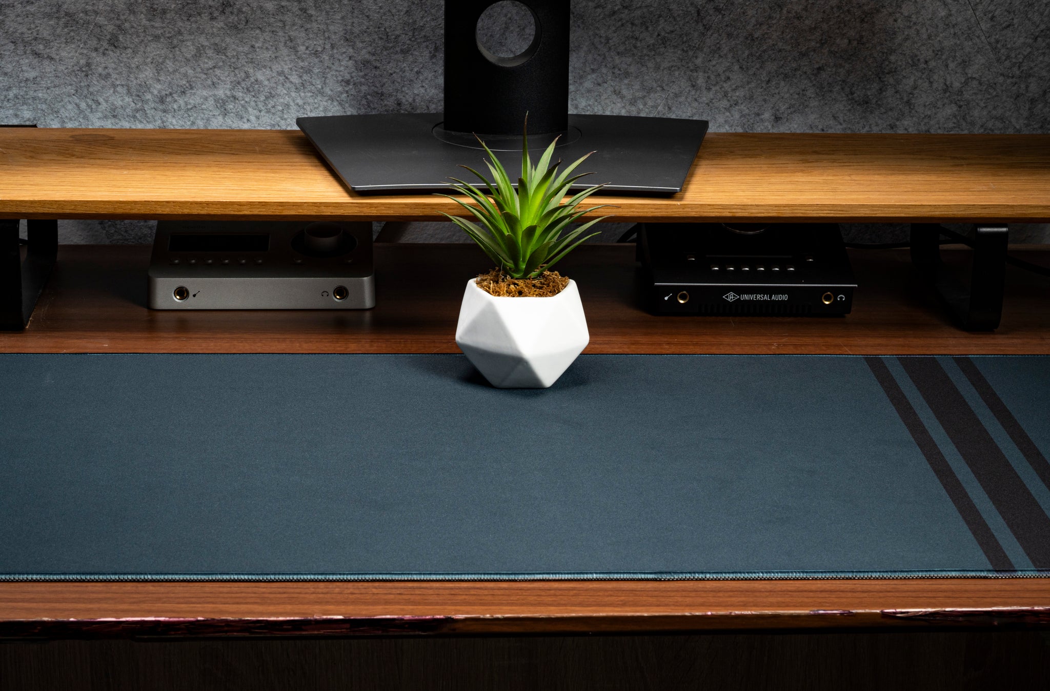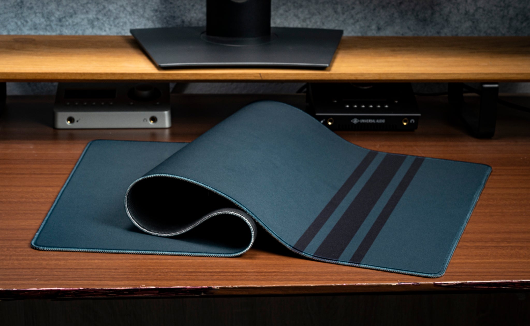 The Apex desk mat is a 900x400mm cloth-top desk mat with stitched edges, anti-slip base, and a minimal race-car design by Fallenfoe to match his Apex PBT keycap set.